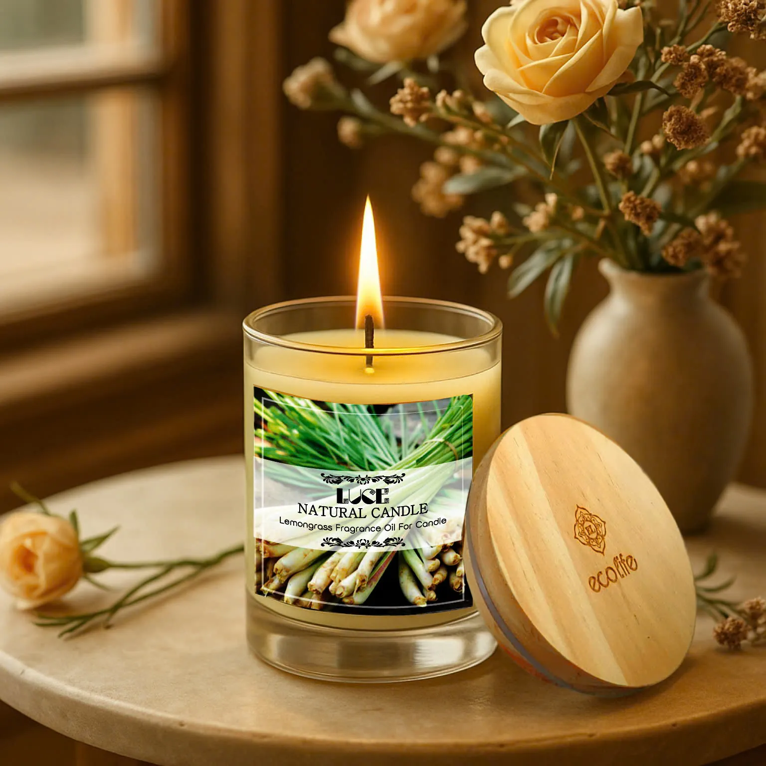 *Chất liệu: Sáp ong , tinh dầu sả chanh, bấc cotton, nắp gỗ tre